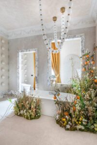 Este año, hemos tenido el placer de colaborar con dos impresionantes espacios. El «Baño de Azahar» del Espacio Jacob Delafon, diseñado por el estudio Dorotea, donde instalamos composiciones de naranjas que evocan frescura y transportan al ambiente del azahar, creando un baño calmado, cálido y fresco que recuerda a la esencia andalusí de principios del siglo XX.