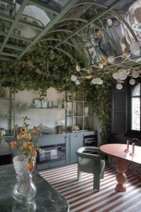Por otro lado, el Espacio VG Living nos sorprende con la cocina «Bella Natura», inspirada en las antiguas orangeries. Este diseño transforma la cocina en un invernadero, generando un ambiente relajado y acogedor donde las plantas son protagonistas.