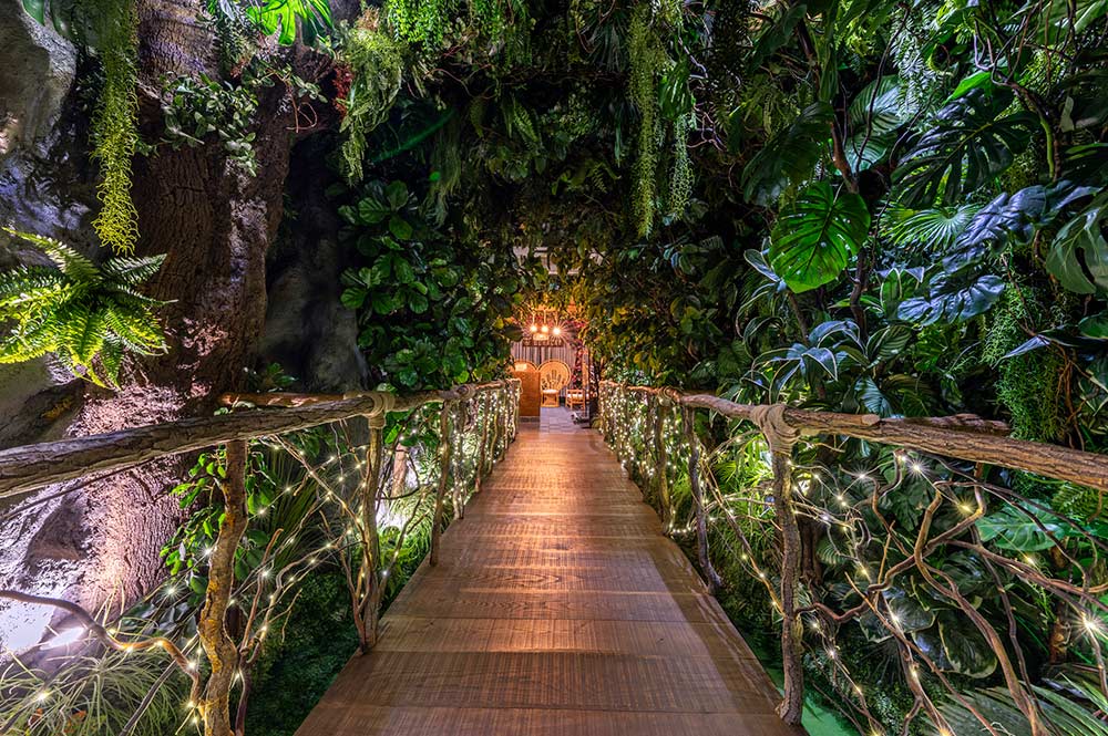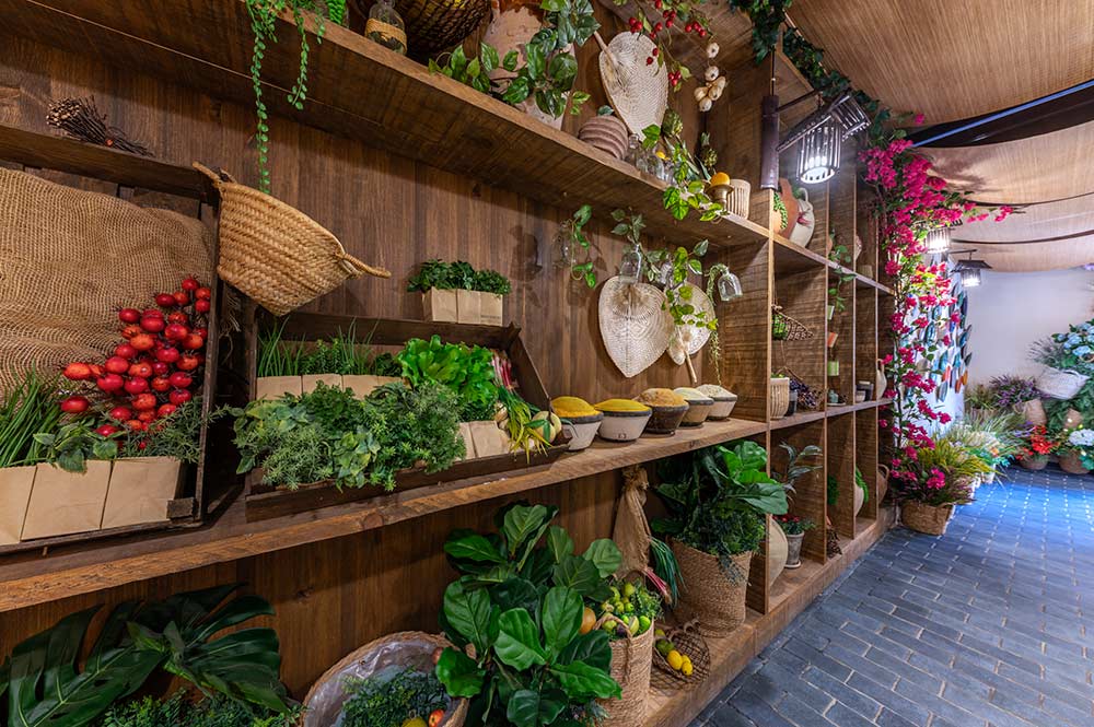 El recorrido interior comienza en un túnel de entrada que conduce hasta un photocall, recreando un mercado asiático con productos, especias y composiciones vegetales en estanterías que combinan color y autenticidad.