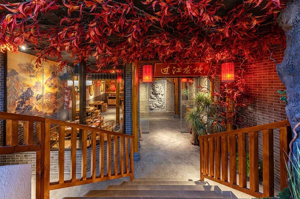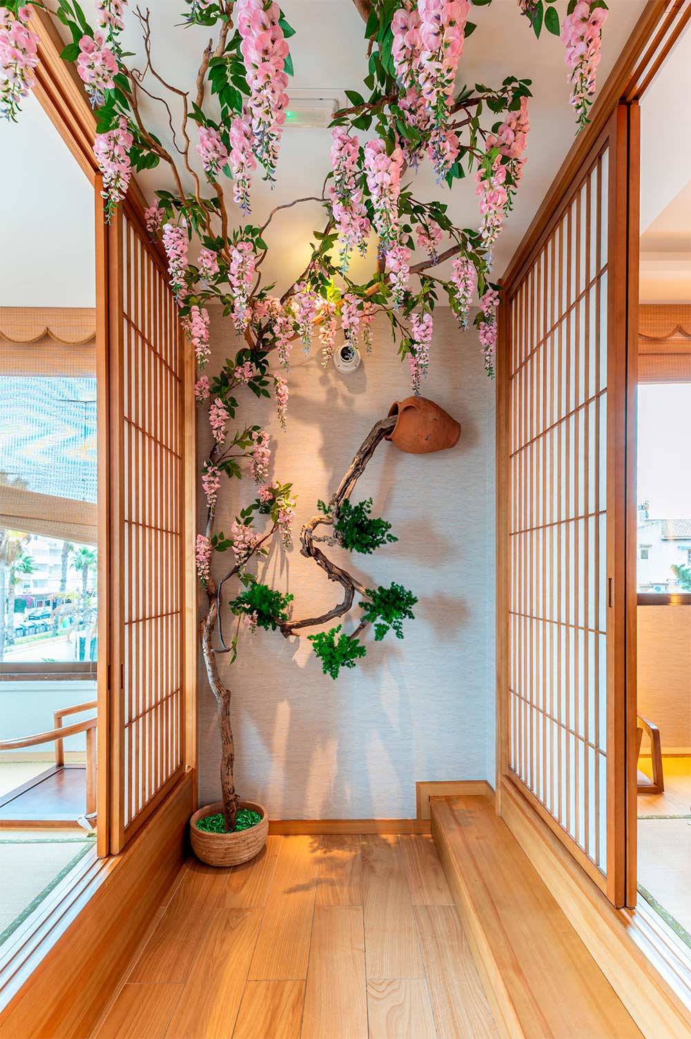 En las salas, la vegetación se adapta a cada atmósfera: desde un elegante Ginkgo biloba integrado en una de las mesas, símbolo de longevidad y equilibrio, hasta una zona dominada por tonos rojos y luces cálidas que evocan lo más íntimo del ambiente asiático.