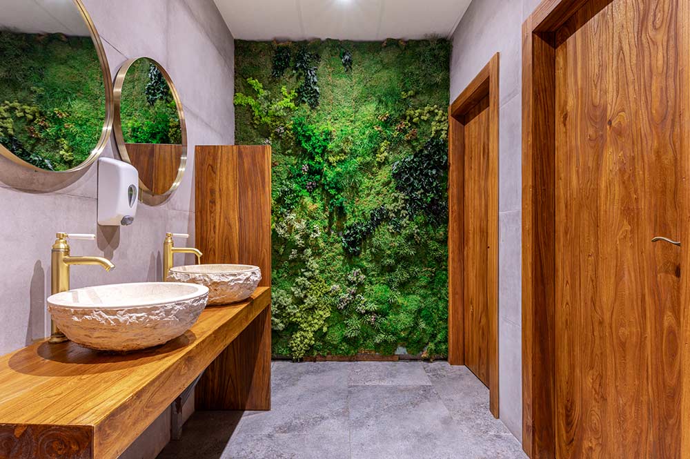 Incluso los baños han sido cuidadosamente ambientados con vegetación, manteniendo la coherencia estética en todo el espacio.