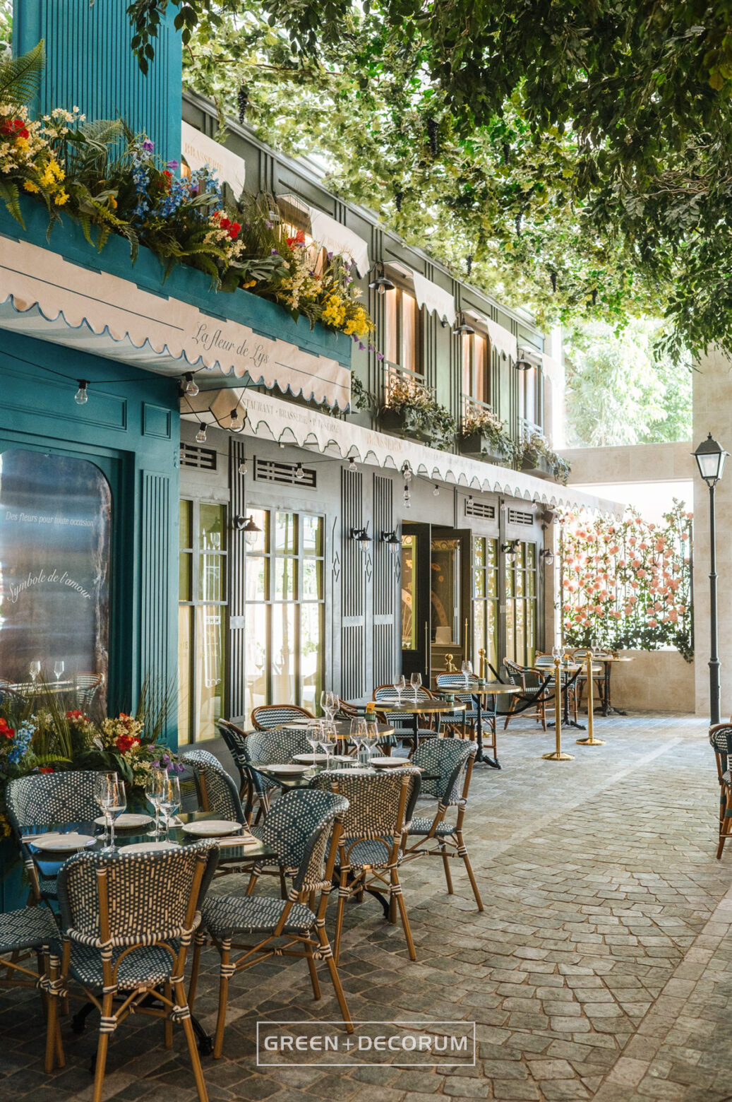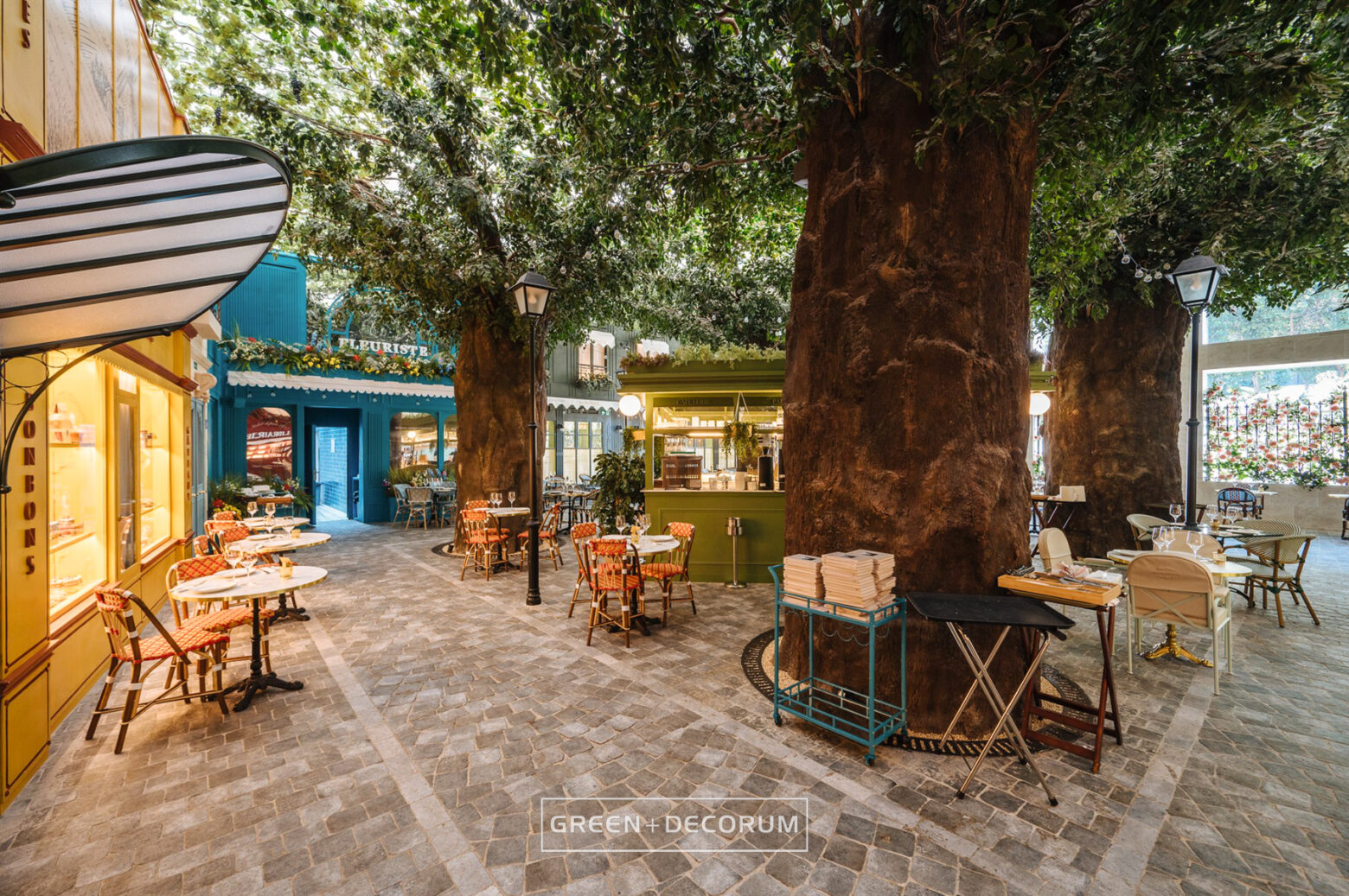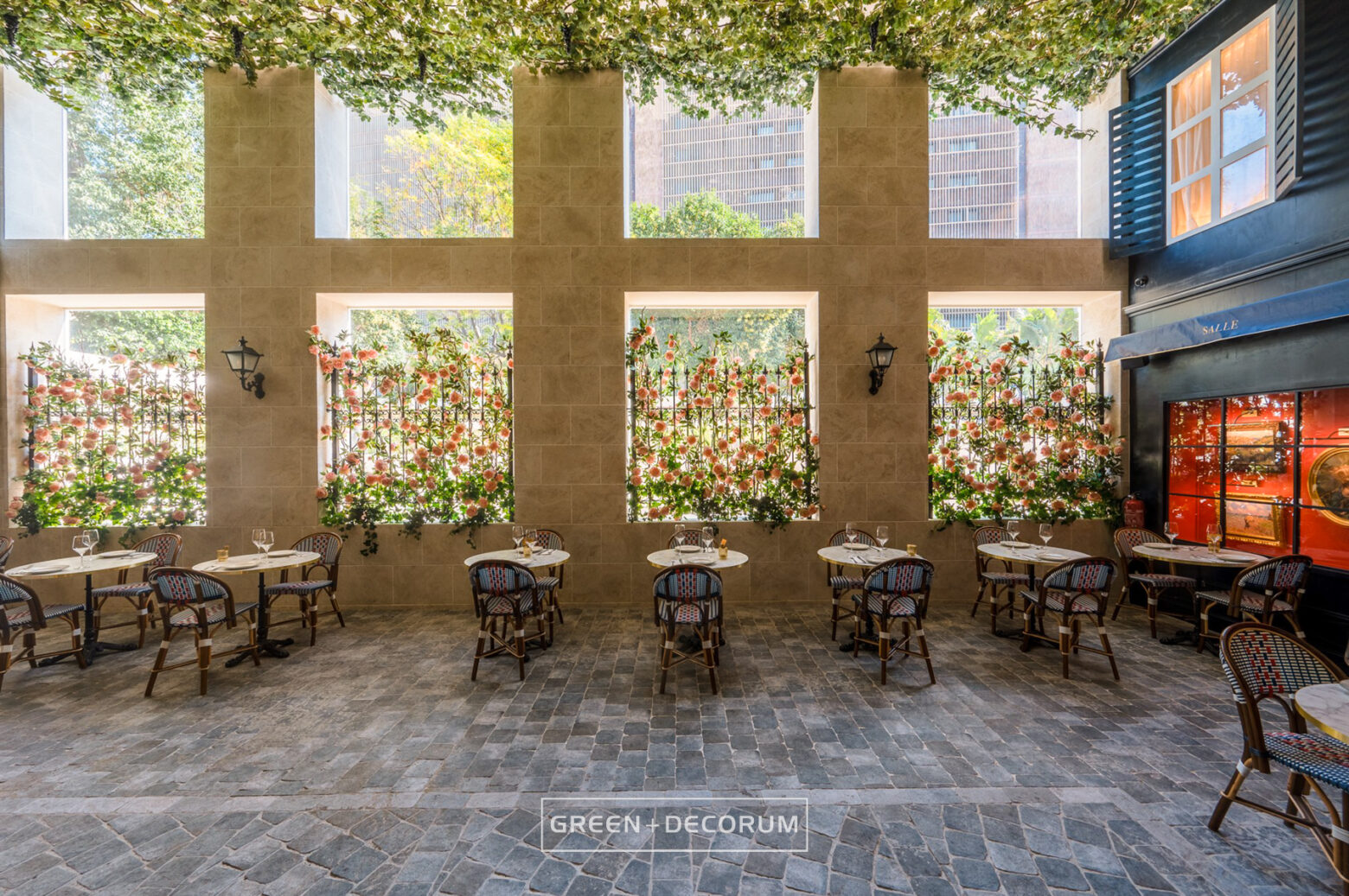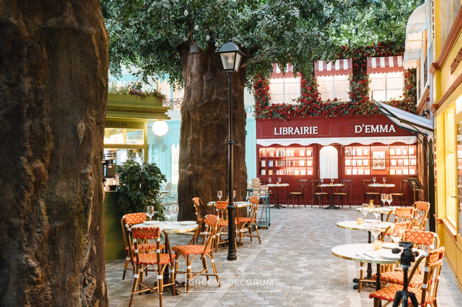 El decorado del proyecto semeja una serie de fachadas de diferentes negocios típicos de la ciudad, como cafeterías, librerías y restaurantes, e incluso la entrada al metro. Las fachadas se llenan de vida con la vegetación. Las rosas, tanto en jardineras como en rejas, se entrelazan con la estructura del local, aportando mucho color que transforman el entorno en un auténtico jardín urbano. Los troncos, que actúan como elementos decorativos, también cumplen una función práctica al cubrir pilares y dar un acabado estético.