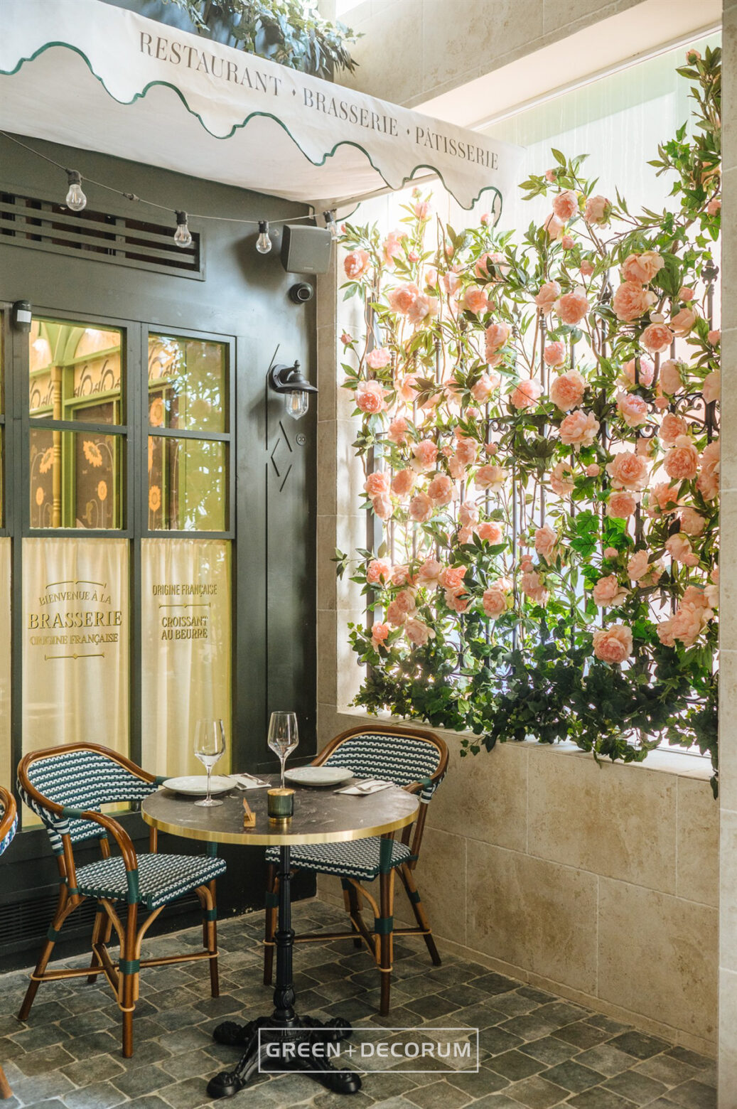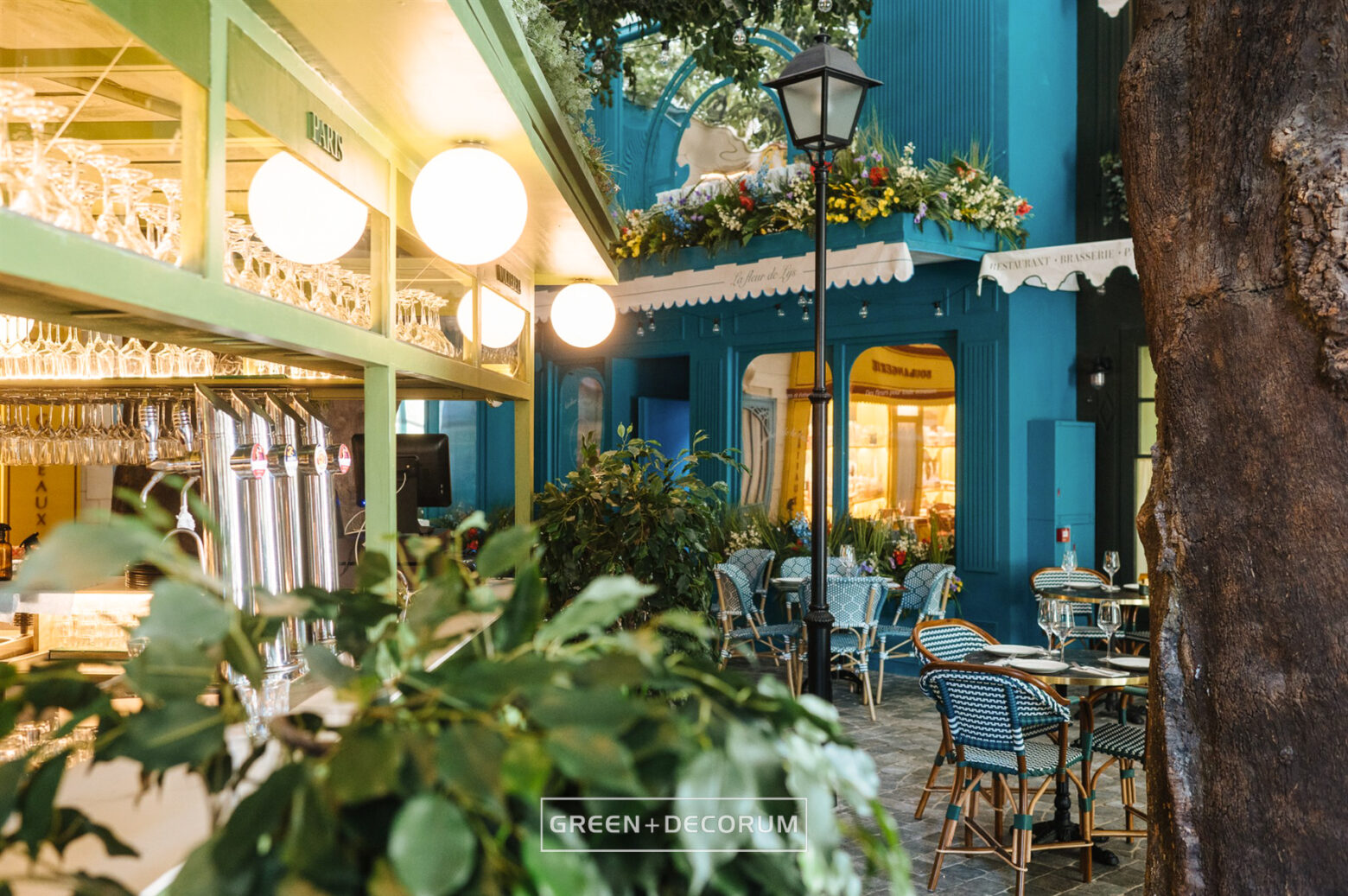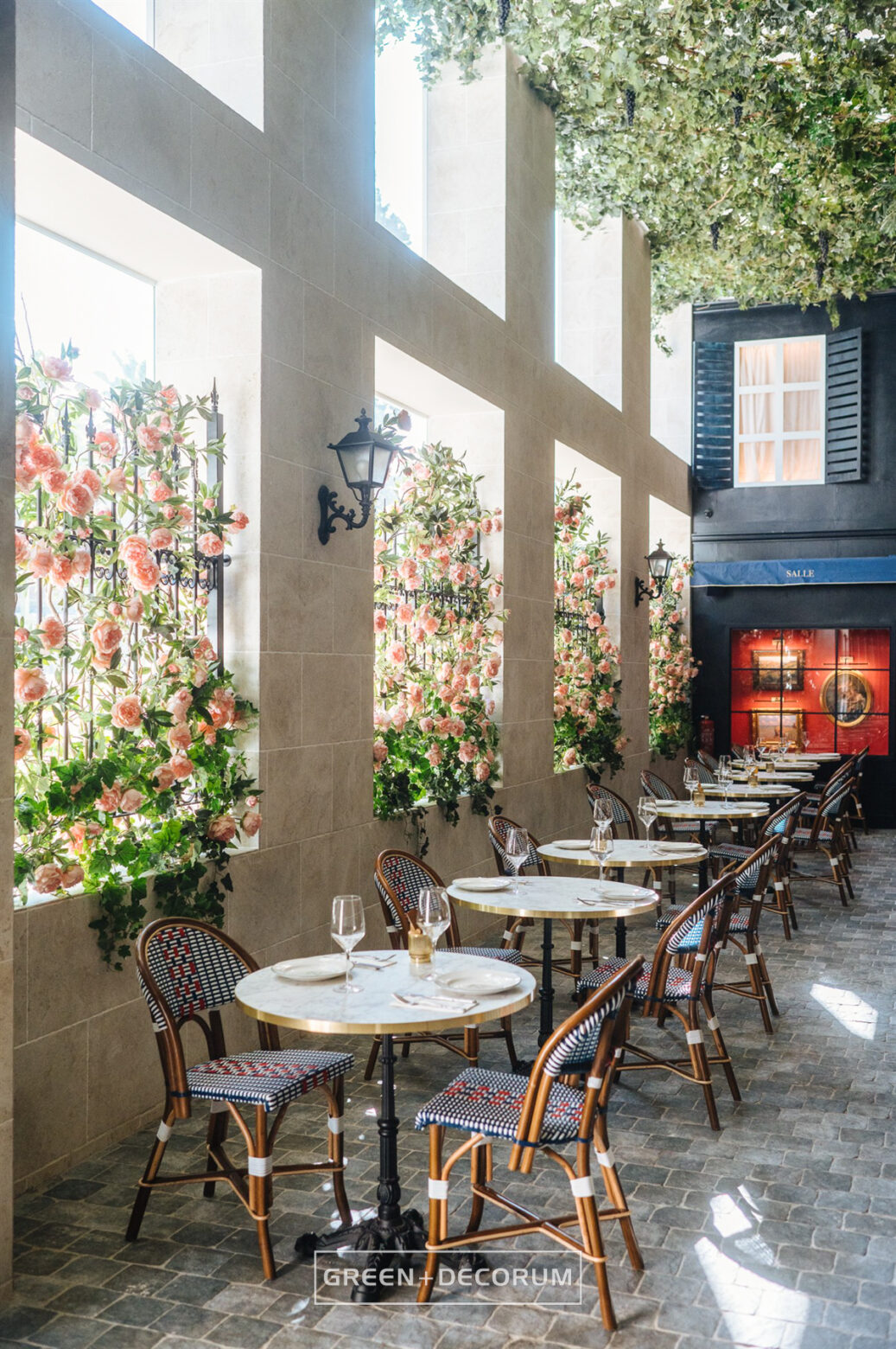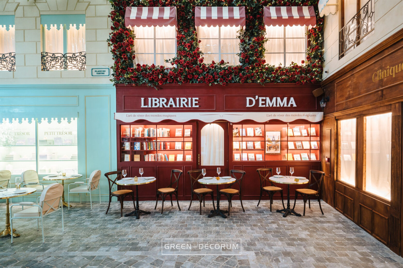 El decorado del proyecto semeja una serie de fachadas de diferentes negocios típicos de la ciudad, como cafeterías, librerías y restaurantes, e incluso la entrada al metro. Las fachadas se llenan de vida con la vegetación. Las rosas, tanto en jardineras como en rejas, se entrelazan con la estructura del local, aportando mucho color que transforman el entorno en un auténtico jardín urbano. Los troncos, que actúan como elementos decorativos, también cumplen una función práctica al cubrir pilares y dar un acabado estético.