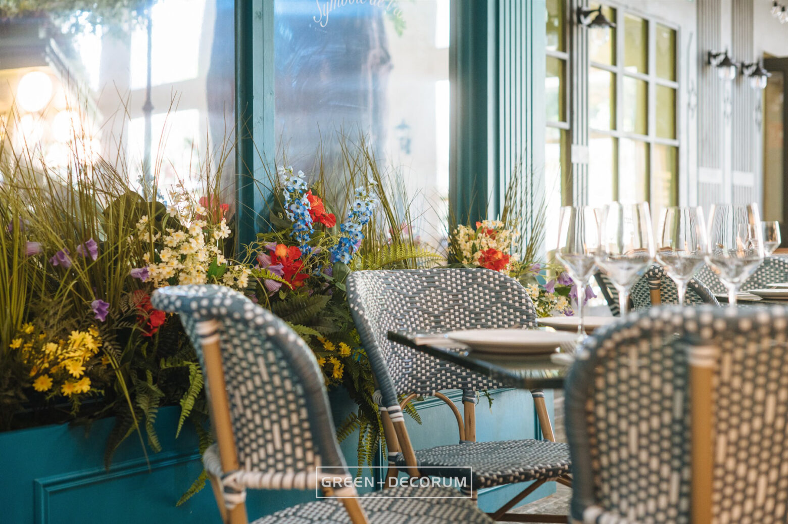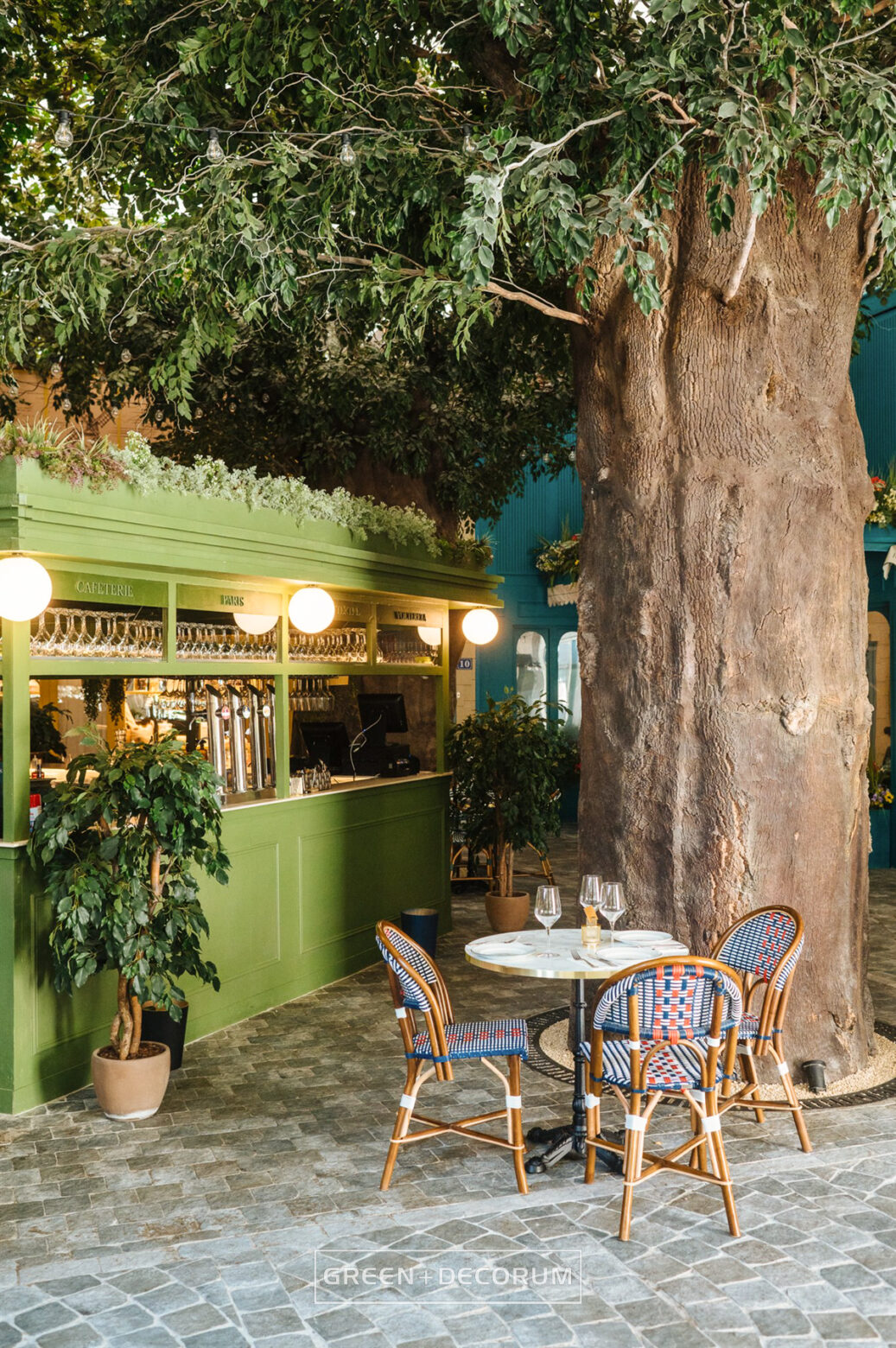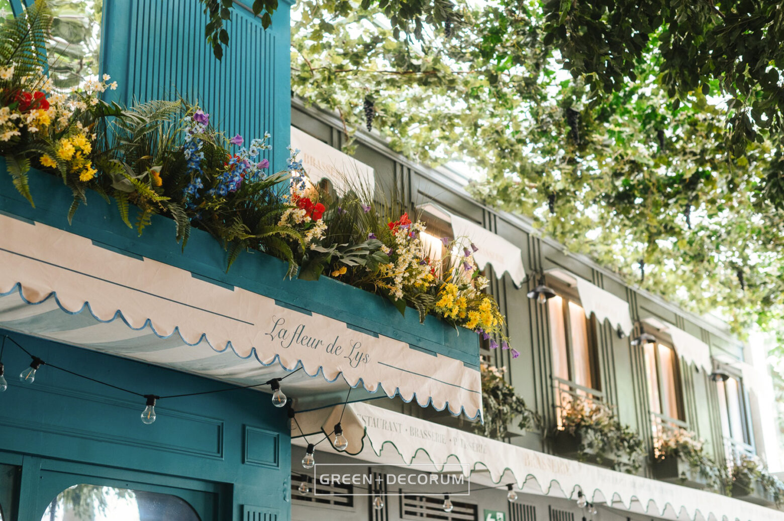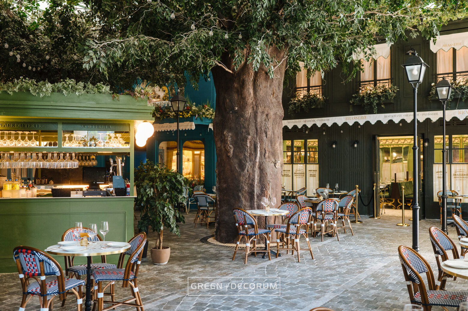El decorado del proyecto semeja una serie de fachadas de diferentes negocios típicos de la ciudad, como cafeterías, librerías y restaurantes, e incluso la entrada al metro. Las fachadas se llenan de vida con la vegetación. Las rosas, tanto en jardineras como en rejas, se entrelazan con la estructura del local, aportando mucho color que transforman el entorno en un auténtico jardín urbano. Los troncos, que actúan como elementos decorativos, también cumplen una función práctica al cubrir pilares y dar un acabado estético.