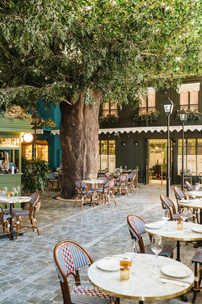 La vegetación también se extiende al techo, donde una capa verde se mezcla con las estructuras arquitectónicas, dando continuidad visual al diseño de todo el espacio. Esta conexión entre el interior y el exterior se refuerza con la presencia de falsas ventanas que, aunque no abren al mundo exterior, permiten que la luz inunde el local a través de paneles traslúcidos, replicando la luminosidad que caracteriza las calles parisinas.
